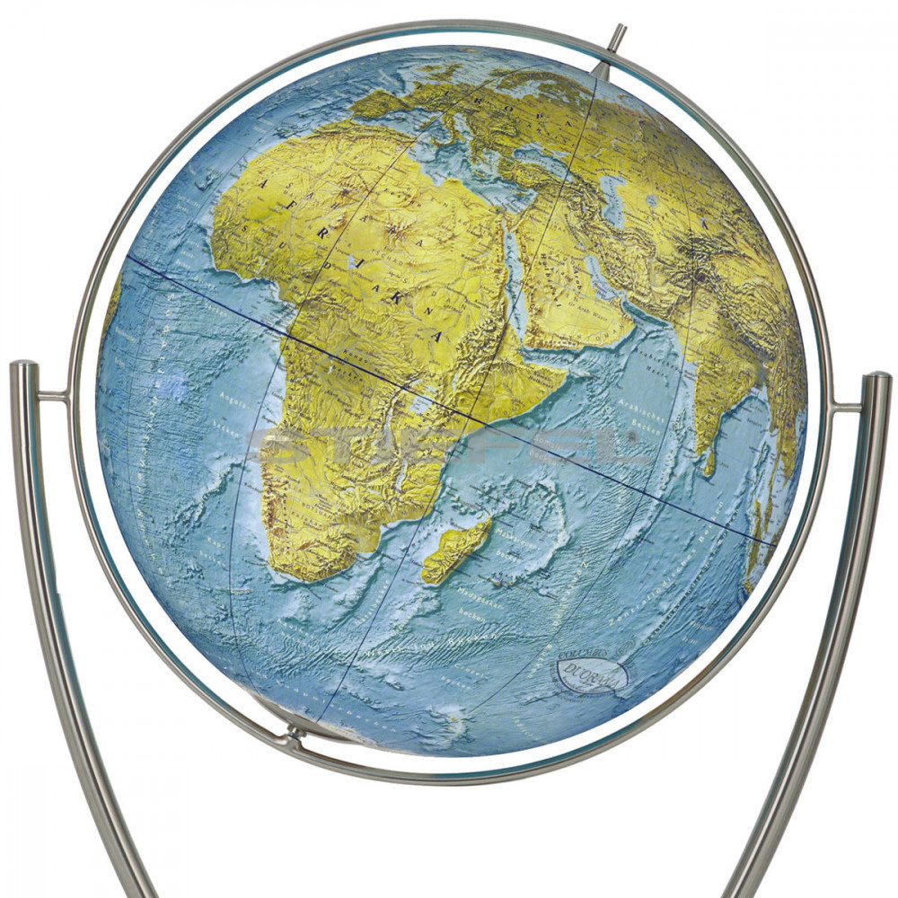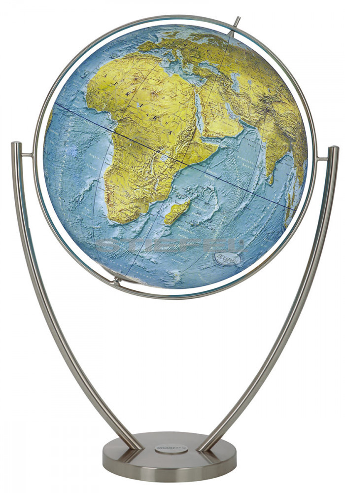 COLUMBUS DUO MAGNUM világítós, álló, politikai színezésű, polietilén, morfológiai földgömb, rozsdamentes acél talppal és meridiánnal.
